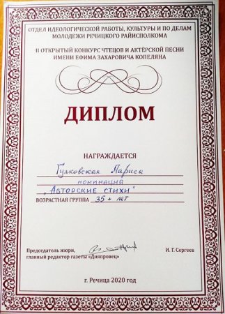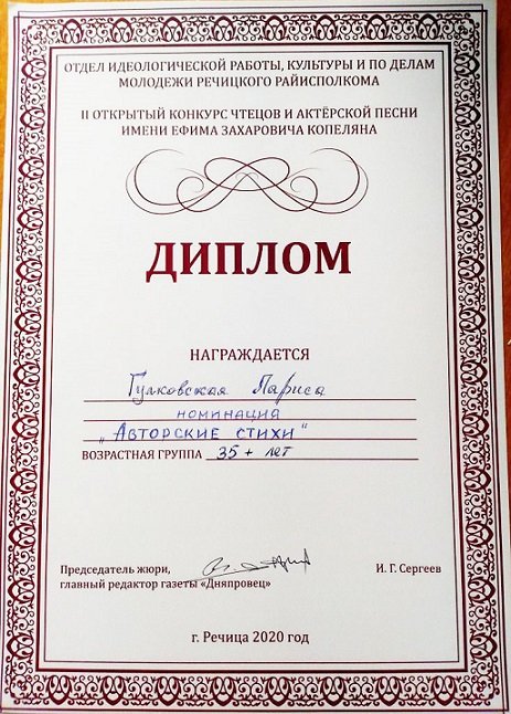 Не зря говорят, что есть время разбрасывать камни, а есть - собирать их. Наши живичане "разбрасывают" не камни, а отправляют на конкурсы самых разных уровней свои авторские материалы - стихи и песни. А потом получают заслуженные награды и поощрения. Подведены итоги Международного конкурса «НАЦИОНАЛЬНАЯ ЛИТЕРАТУРНАЯ ПРЕМИЯ ЗОЛОТОЕ ПЕРО РУСИ – 2020». В номинации «Литературные переводы» дипломом им. Шекспира награждены члены народного клуба «Живица»: - Мария Лебедько (г. Минск, Беларусь) за переводы книг русскоязычных авторов на белорусский язык; - Тамара Березина (г. Молодечно, Минская обл., Беларусь) за переводы книг русскоязычных авторов на белорусский язык; - Анатолий Мозгов (г. Борисов, Минская обл., Беларусь) за переводы книг русскоязычных авторов на белорусский язык. Отмечена дипломом открытого конкурса чтецов и авторской песни им. Е.Капеляна (г.Речица, Гомельская обл.) Лариса Гулковская из Солигорска. Валерий Коняхин (г.Марьина Горка, Минский район) награждён почётной грамотой. Руководитель клуба - Ирина Карнаухова получила нагрудный знак Международного Союза писателей и мастеров искусств" "Почётный наставник творческой молодёжи". Радуемся успеху наших коллег, их творческому росту и признанию. И, конечно, мы гордимся, когда участники народного клуба композиторов и поэтов "Жывiца", совершенствуя мастерство, становятся профессионалами. Значит, не зря существует наш клуб, где каждый из авторов получает и помощь, и дружескую поддержку. Желаем в дальнейшем новых побед! Инна Кузина
